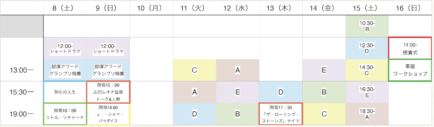 そうですね、それも他の映画祭にない特色ですね。8日間映画祭を行う理由としては、那須が観光地であることから、土日にかかるように開催したいという点です。土日を2回入れて9日間、そのうち月曜日は休業で、計8日になります。地元のお客様が多いものの、観光がてらいらっしゃるお客様のことも意識しています。短編は一日最大5プログラムまで上映できるので、平日のみの方にも土日のみの方にも可能な限り鑑賞機会を増やしたいという思いがあります。