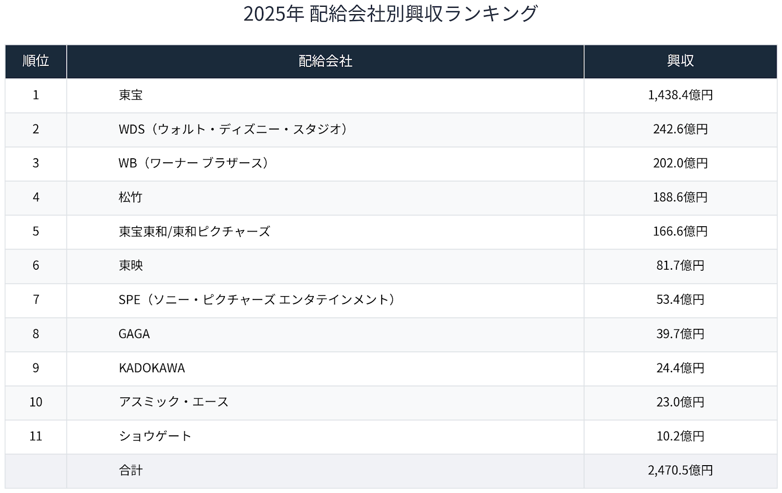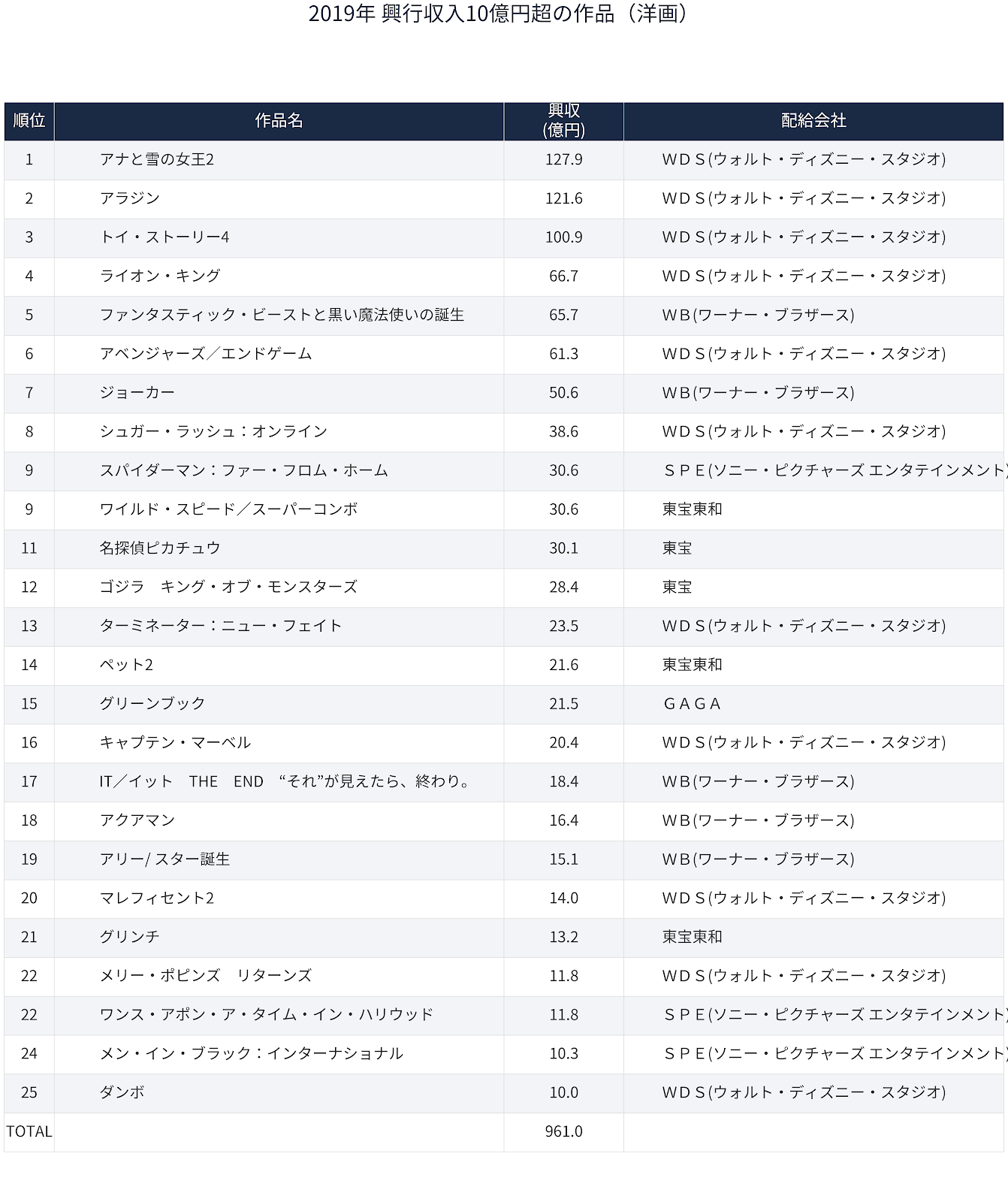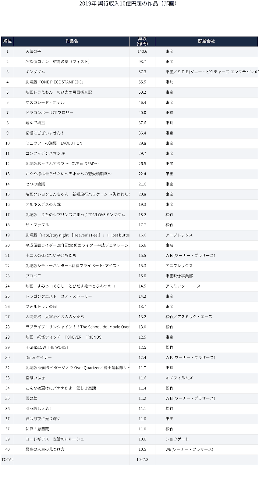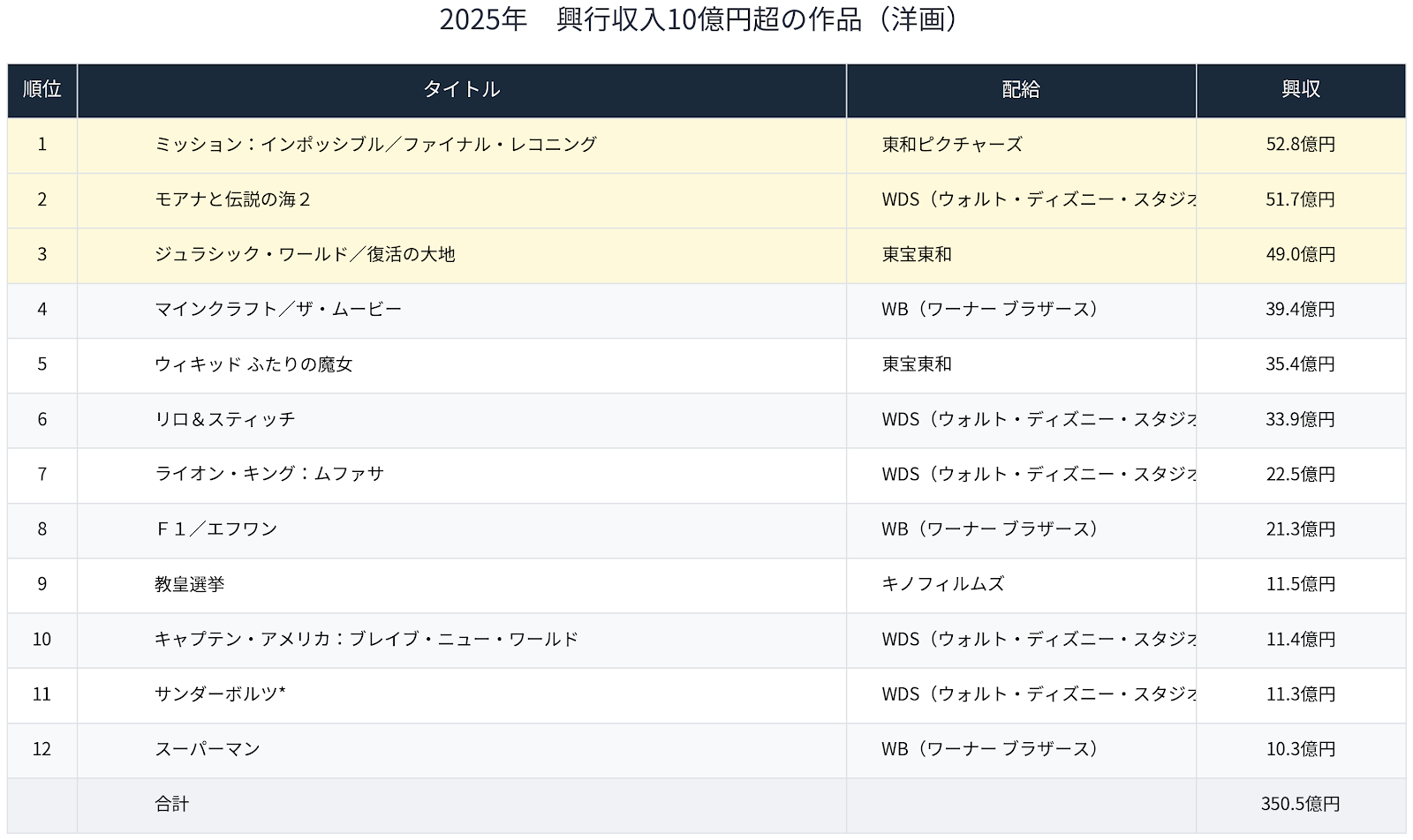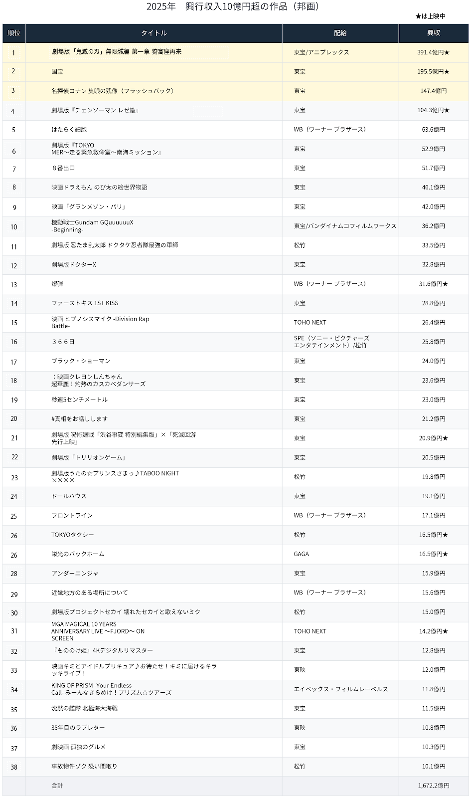Aniplex、Bandai Namco、avex picturesといった配給会社の存在感が強くなり、ユニヴァーサル、パラマウントに続いて今年からWBも日本での配給業務を東宝東和に委託したが、このベストテンを見るとそれもうなずける。
