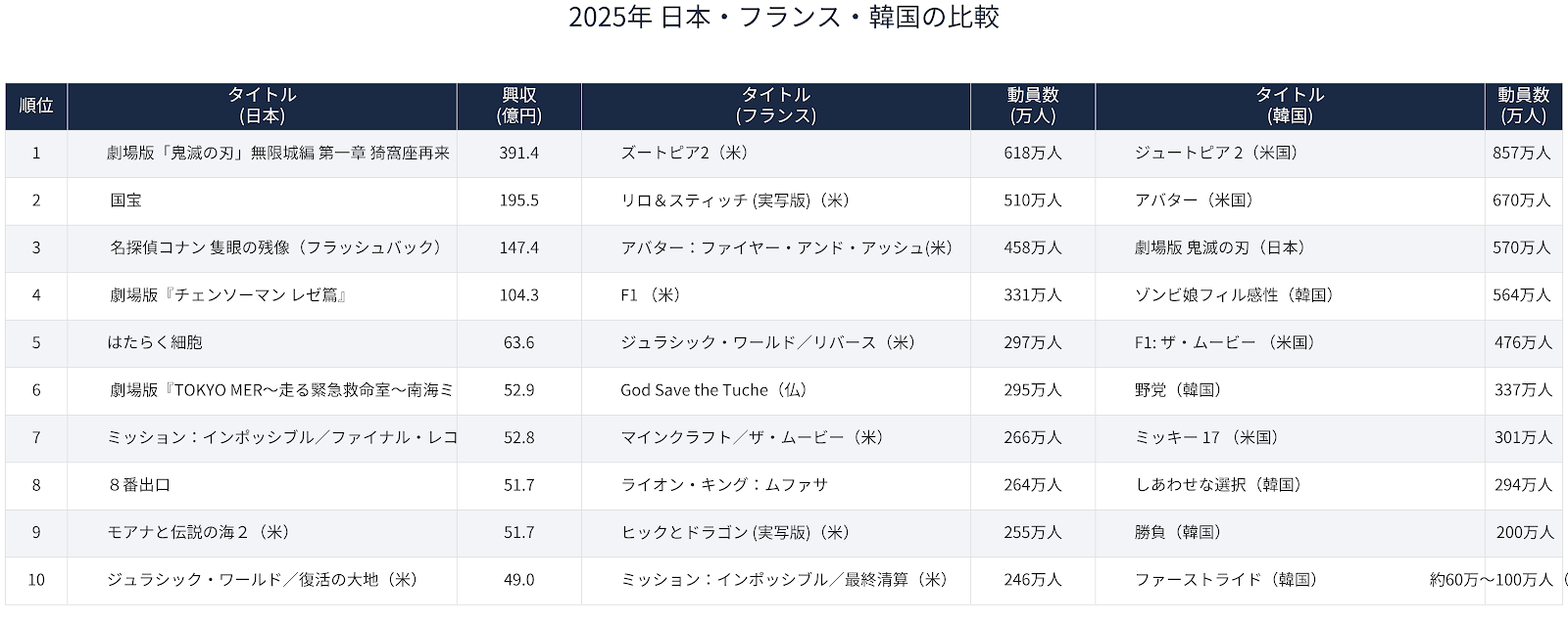 さらにもう一つ、ハリウッド各社が日本での配給業務から撤退する理由がある。それは日本市場の特殊性だ。世界的に見て、ハリウッド対現地国の構成比が25%対75%という国はない(インドを除く)。参考に韓国とフランスの年間興行ベストテンのチャートを見てください(表8 参照)。日本映画には興収100億円を超えるアニメが年間数本あり、さらに実写でも「働く細胞」、「劇場版『TOKYO MER~走る緊急救命室~南海ミッション』」といった作品が軽々とハリウッドの大作を超えている。