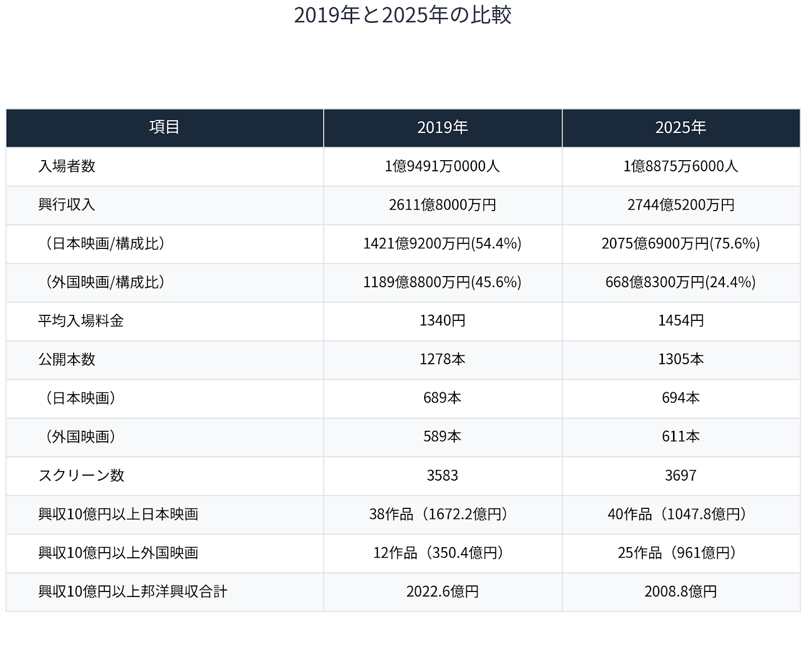2019年の観客数は1億9491万0000人で平均入場料金は1340円。2025年の平均入場料金は1454円なので114円低かった。2019年の観客数で2025年の平均入場料金なら約2834億円になり、興収も2番目となっていたことになる。最近はIMAXや4DXなどの高額料金の上映も多く、作品によって平均入場単価も異なってくる。私が「キネマ旬報」の編集者だったころから書いていたが、やはり過去と比較するためにも観客数を分かる範囲で併記したらいいのではと思う。2019年と2025年のわずか6年の間でも順位が変わってしまうのだから。(表5参照)