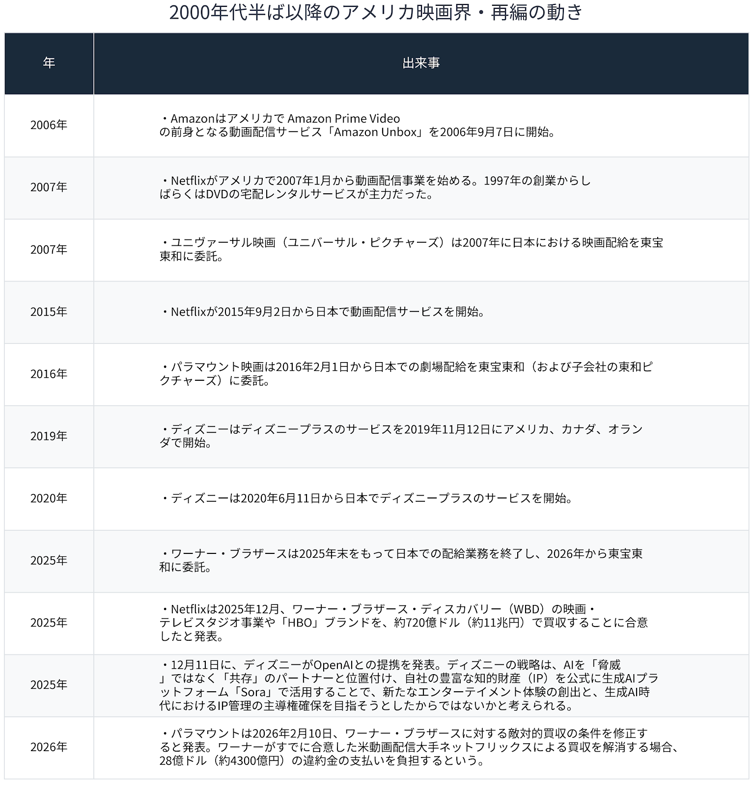 コロナ・ウィルスによる世界的なパンデミックによって状況が一変したのだが、実は2000年代半ばから、アメリカの映画界は再編の動きがあり、それがコロナ禍によって一気に顕在化した。時系列に並べてみよう。