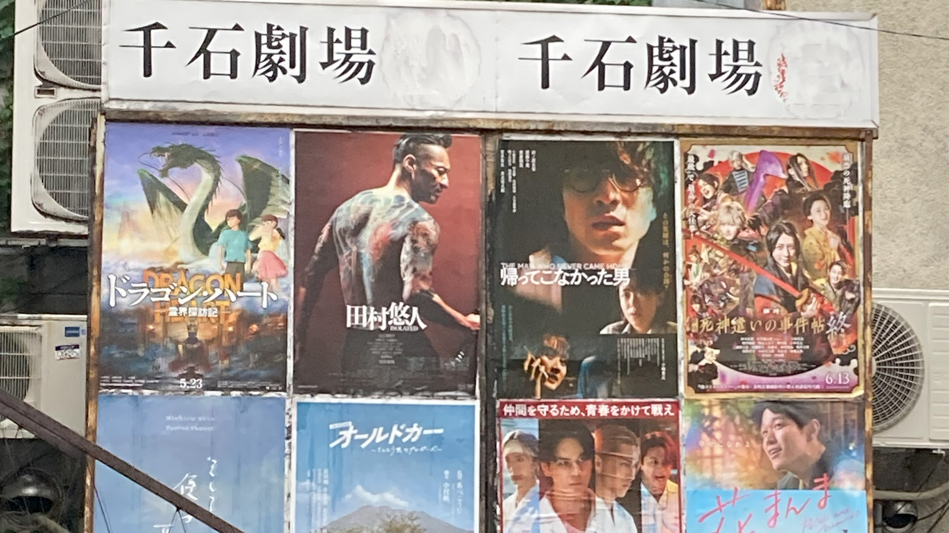 地図を見ると長野駅から徒歩数分。駅前から路地を少し入ると、長野千石劇場が見えてきた。かなり古そうな建物だ。ポスターの貼り方も昔ながらの風情を感じる。